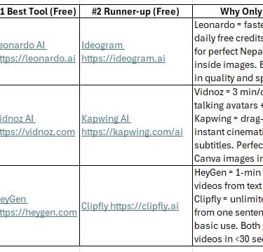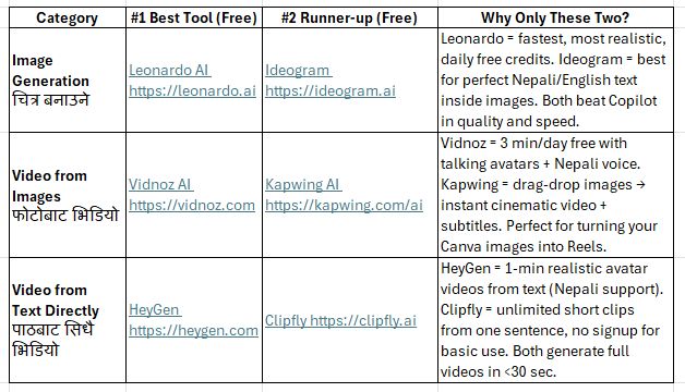 सबैभन्दा राम्रो खबर यो हो कि यो क्रान्तिको शक्ति सबैका लागि पहुँचयोग्य छ, प्रायः निःशुल्क नै। कुनै पनि नेपाली सामग्री सिर्जनाकर्ता वा व्यवसाय मालिकले पनि परीक्षण वा प्रयोग गर्न खोजिरहनुभएको छ भने यी तीन उपकरण वर्गहरूले तुरुन्तै सुरु गर्ने बिन्दु दिन्छन् :